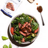 Add 10oz of your favorite greens to a large serving bowl. Add sliced cucumbers and tomato wedges to the bowl. Toss greens with dressing from your pan.