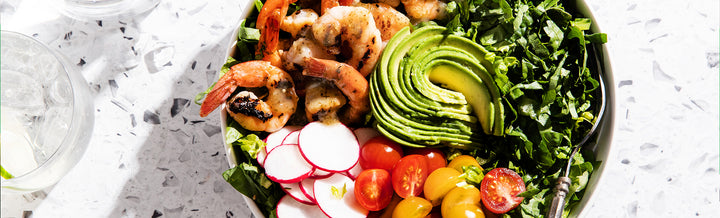 Once all your shrimp is grilled to perfection, plate your salad; romaine on the bottom with shrimp, avocado, cherry tomatoes and radishes on top. Drizzle shrimp with any remaining sauce from the pan. Serve and Enjoy!