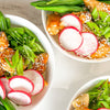 Top the risotto with chicken and garnish with the remaining green onions, nori, additional Parmesan and chilies.