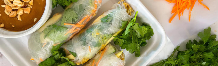Place sheet on a cutting board. Add some rice noodles, Kevin's Thai Coconut Chicken, carrots, mango, cucumber, and cilantro on top.