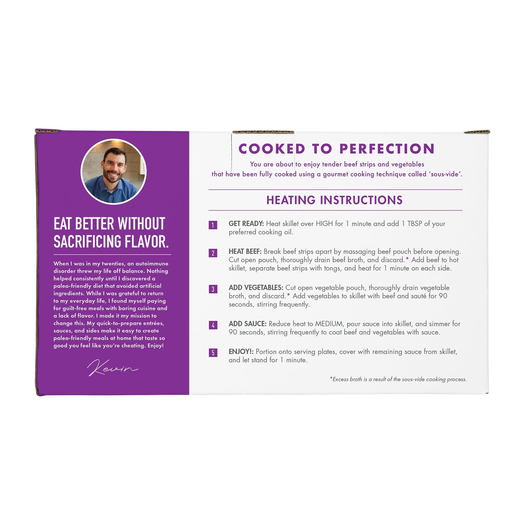 Broccoli (Broccoli, Water, Vinegar, Sea Salt, Cultured Onion Juice, Magnesium Oxide, Xanthan Gum, Black Pepper), Beef Sirloin In Beef Broth Cooked Out As A Result Of The Sous-Vide Process (Beef, Water, Vinegar, Yeast Extract, Sea Salt, Cultured Onion Juice, Black Pepper, Citrus Extract), Stir Fry Sauce (Water, Coconut Aminos [Coconut Nectar, Water, Sea Salt], Coconut Nectar, Sherry Wine, Prune Juice Concentrate, Roasted Sesame Oil, Apple Cider Vinegar, Vinegar, Chicken Stock [Chicken Stock, Salt], Shiitake Mushroom, Tapioca Starch, Dehydrated Garlic, Yeast Extract, Smoked Onion, Roasted Dehydrated Garlic, Xanthan Gum, Dehydrated Onion, Dehydrated Ginger, Chilies, Spices).