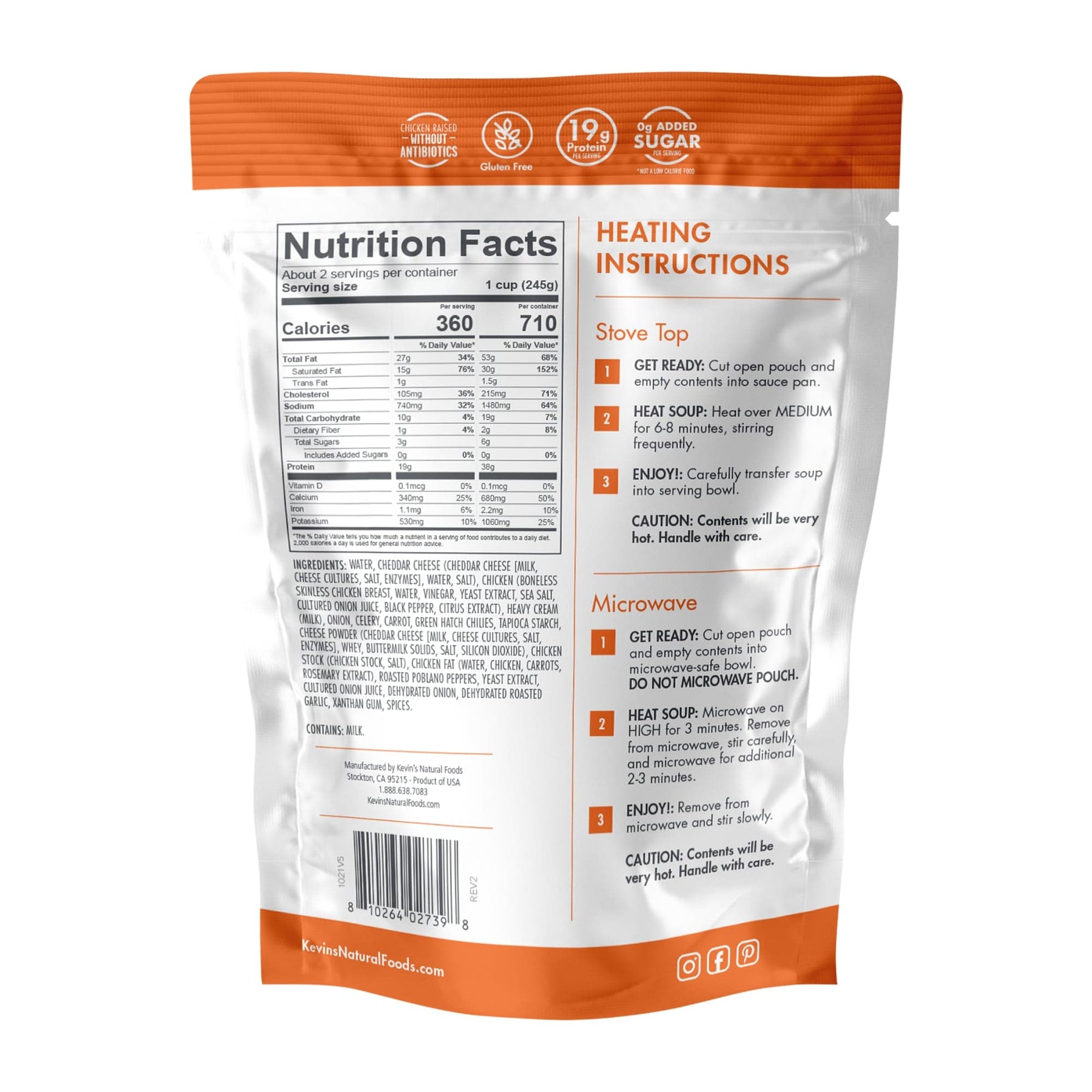 Water, Cheddar Cheese (Cheddar Cheese [Milk, Cheese Cultures, Salt, Enzymes], Water, Salt), Chicken (Boneless Skinless Chicken Breast, Water, Vinegar, Yeast Extract, Sea Salt, Cultured Onion Juice, Black Pepper, Citrus Extract), Heavy Cream (Milk), Onion, Celery, Carrot, Green Hatch Chilies, Tapioca Starch, Cheese Powder (Cheddar Cheese [Milk, Cheese Cultures, Salt, Enzymes], Whey, Buttermilk Solids, Salt, Silicon Dioxide), Chicken Stock (Chicken Stock, Salt), Chicken Fat (Water, Chicken, Carrots, Rosemary Extract), Roasted Poblano Peppers, Yeast Extract, Cultured Onion Juice, Dehydrated Onion, Dehydrated Roasted Garlic, Xanthan Gum, Spices.