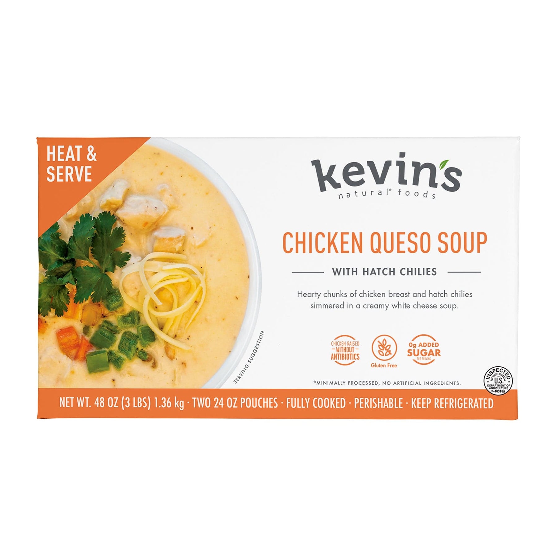 I heat pieces of rotisserie chicken in skillet and top with Kevin’s Chicken Queso Soup w/hatch chiles . Serve over rice with veggies on the side makes a nice quick meal. It also works well with Thai- style coconut Chicken Soup over rice. Ten mins or less dinner is served. I like simple tasty dishes, and I have been looking for a way to use the rotisserie chicken I have in the fridge. Love Kevin’s meals and (Soups)