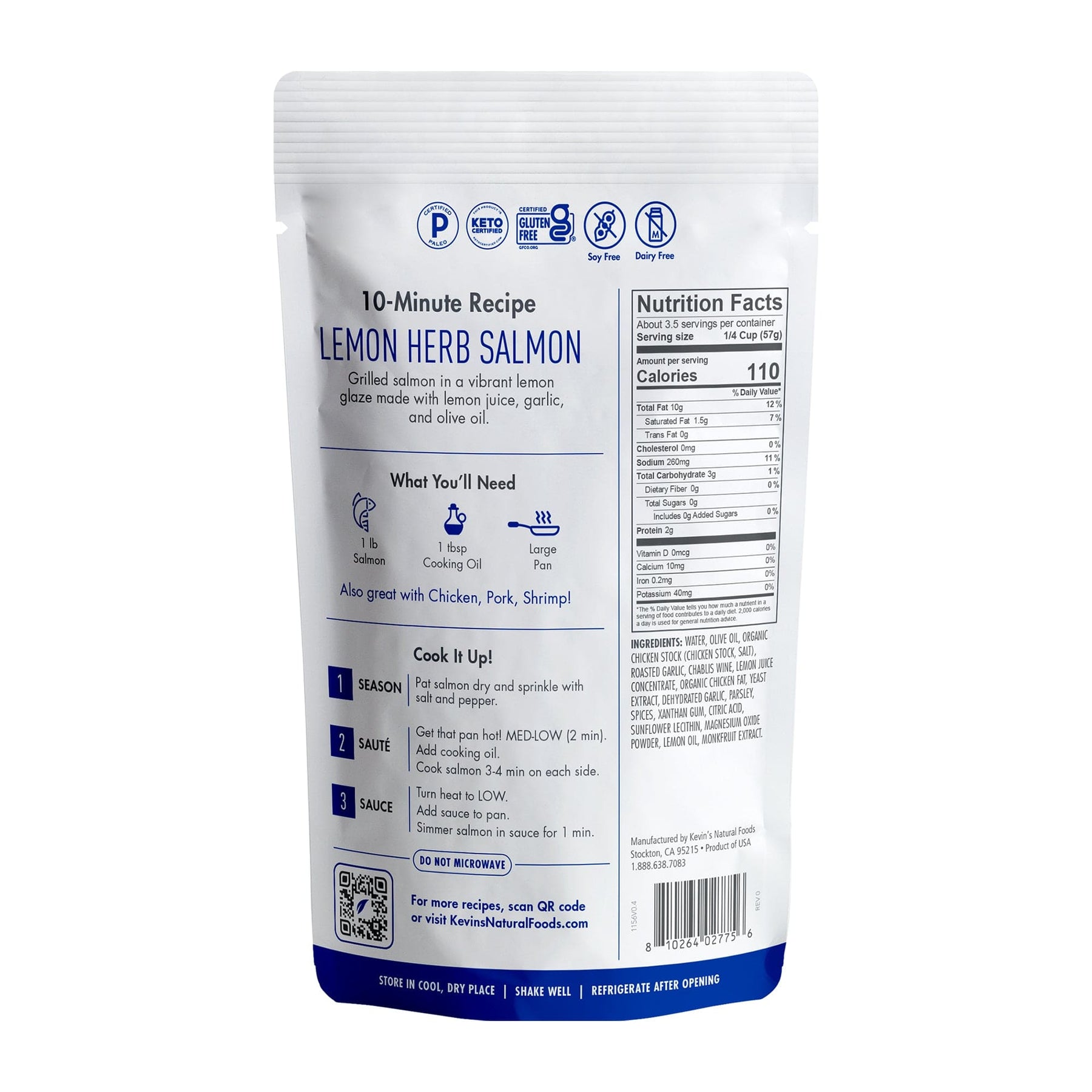 Water, Olive Oil, Organic Chicken Stock (Chicken Stock, Salt), Roasted Garlic, Chablis Wine, Lemon Juice Concentrate, Organic Chicken Fat, Yeast Extract, Dehydrated Garlic, Parsley, Spices, Xanthan Gum, Citric Acid, Sunflower Lecithin, Magnesium Oxide Powder, Lemon Oil, Monkfruit Extract.
