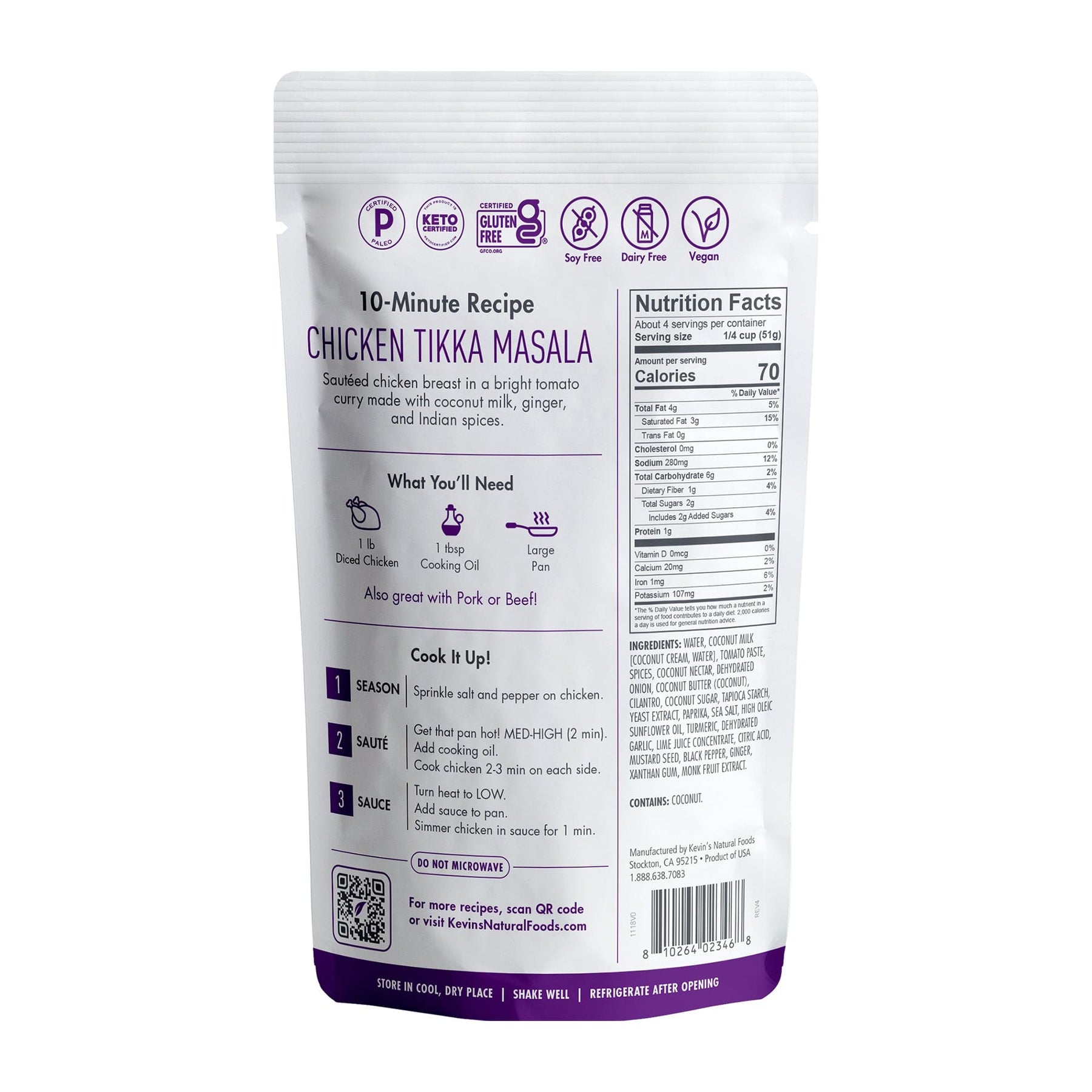 Water, Coconut Milk (Coconut Cream, Water), Tomato Paste, Spices, Coconut Nectar, Dehydrated Onion, Coconut Butter (Coconut), Cilantro, Coconut Sugar, Tapioca Starch, Yeast Extract, Paprika, Sea Salt, High Oleic Sunflower Oil, Turmeric, Dehydrated Garlic, Lime Juice Concentrate, Citric Acid, Mustard Seed, Black Pepper, Ginger, Xanthan Gum, Monk Fruit Extract.